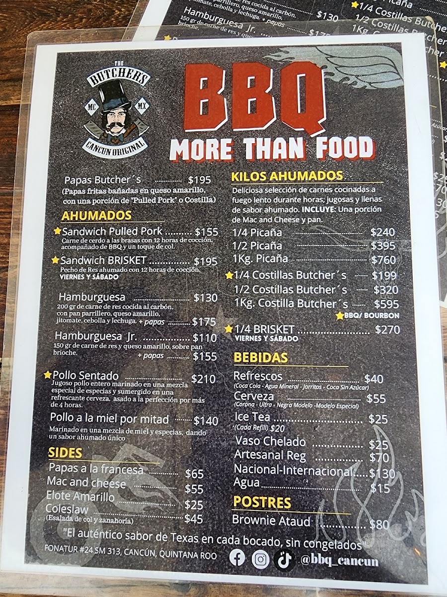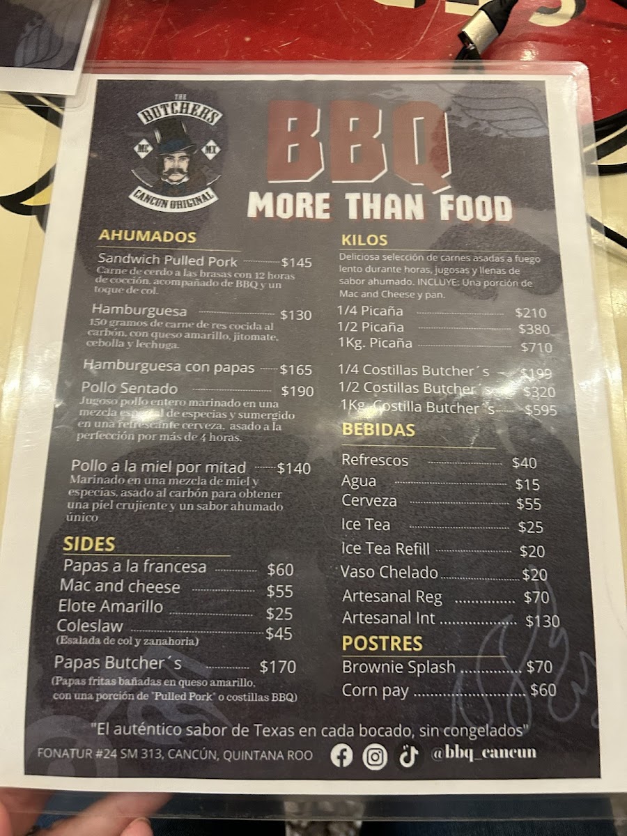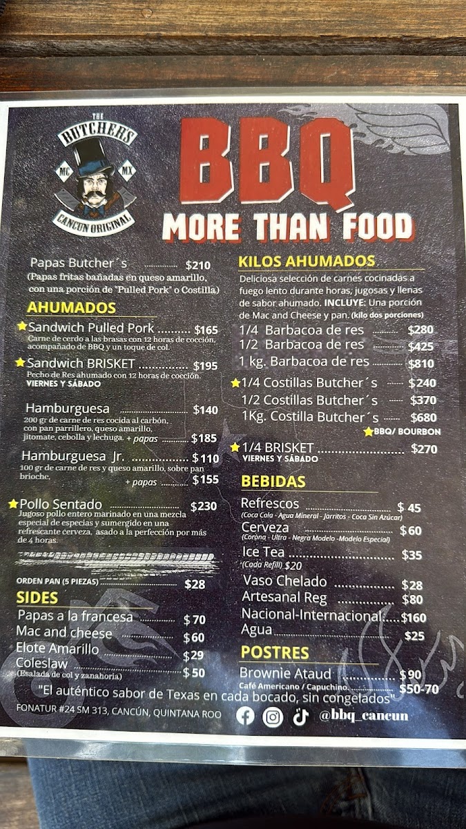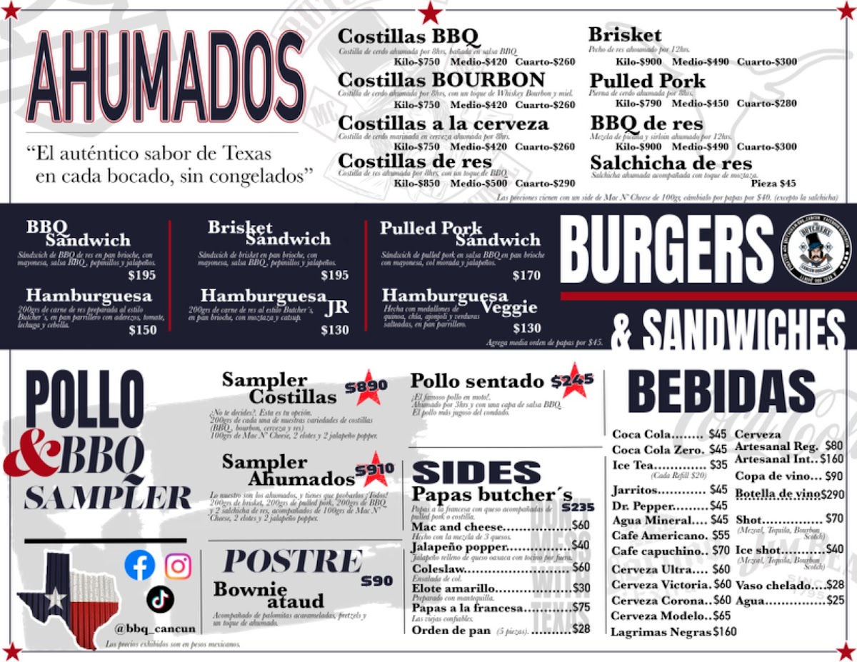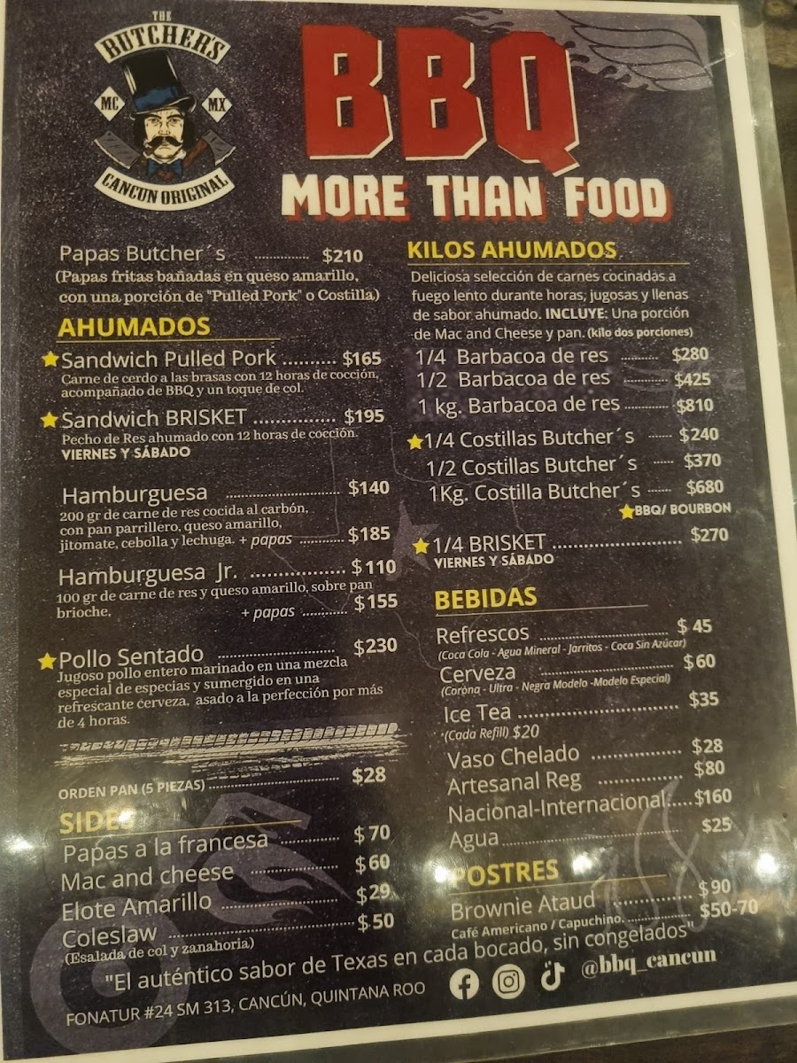 The menu at The Butcher’s Mc Cancún offers a variety of mouthwatering options, with a focus on rich, hearty flavors. Among the standout dishes is the Sandwich de Brisket, a tender, slow-cooked brisket served on a fresh, toasted bun that melts in your mouth with each bite. For those craving a unique twist on classic American barbecue, this dish is a must-try. Other highlights include their juicy steaks, expertly prepared and perfectly seasoned, offering an indulgent experience for meat lovers. The sides complement the main dishes beautifully, with crispy fries and tangy sauces adding extra layers of flavor. The casual yet inviting atmosphere makes this a perfect spot for a satisfying meal that brings together both quality and comfort.